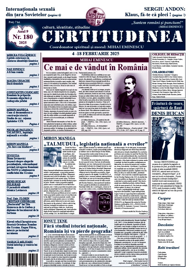 DIN SUMAR ● MIHAI EMINESCU. Ce mai e de vândut în România ● MIRON MANEGA. „Talmudul, legislația națională a evreilor” ● IONUȚ ȚENE. Fără studiul istoriei naționale, România își va pierde geografia! ● DENIS BUICAN. „Frântură de soare, spărtură de flaut” ● MIRCEA VULCĂNESCU. Ispitele exterioare în căutarea identității lăuntrice ● NAE IONESCU. A fi…