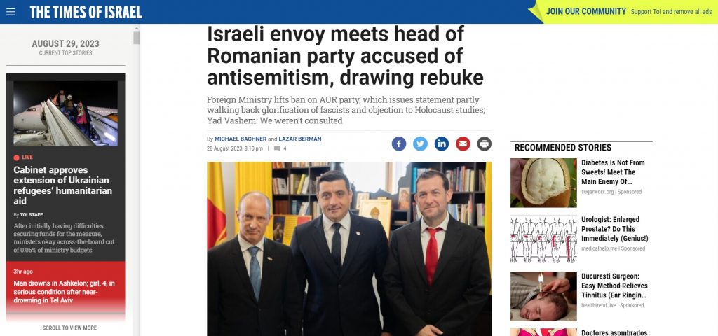 P.S. Articolul din Times of Israel despre „istorica” întâlnire dintre George Simion și Reuven Azar (la care a participat și Yossi Dagan, Șeful Consiliului Regional Samaria) are titlul „Israeli envoy meets head of Romanian party accused of antisemitism, drawing rebuke” și poate fi urmărit AICI.