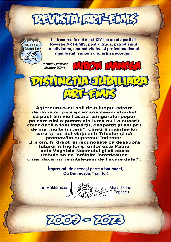 Revista ART-EMIS (www.art-emis.ro) a împlinit 14 ani de viață! 14 ani de rezistență în fața aversiunilor (dar și a seducțiilor) globaliste și antiromânești, în care vocea ei nu și-a schimbat impostația după împrejurări sau împrejurimi politice. ART-EMIS: un camarad loial și netemător, pe același front de luptă cu CERTITUDINEA, care va împlini și ea, în curând… tot 14 ani – în primul ei format online (www.certitudinea.ro)…