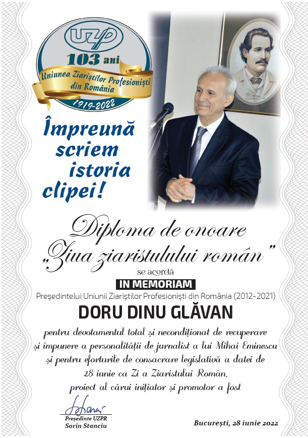 Ieri, 28 iunie, la sala AGIR din București, a avut loc cea de-a noua ediție a Zilei Ziaristului Român, celebrată de UZPR începând din 2014, la inițiativa lui Doru Dinu Glăvan, președintele Uniunii (2012-2021). Cu această ocazie s-au decernat „Premiile Eminescu Ziaristul”, pe care UZPR le acordă începând din 2013, tot la inițiativa lui Doru Dinu Glăvan. Evenimentul a debutat cu „Imnul Jurnalistului” (muzica Mihai Napu, versuri Miron Manega), urmat de cuvântul de deschidere al președintelui interimar Sorin Stanciu. Rolul de amfitrion a fost preluat apoi de Lavinia Șandru, membră UZPR, secondată de Sorin Stanciu, care a înmânat „darurile” (diplomele) laureaților.