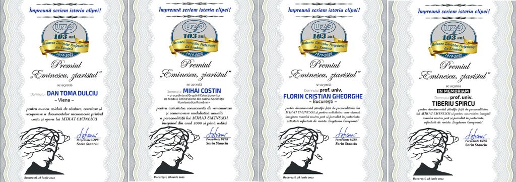 A urmat premierea lui MIHAI COSTIN, președintele Grupării Colecționarilor de Medalii Eminesciene din cadrul Societății Numismatice Române, grupare înființată în anul 2000.