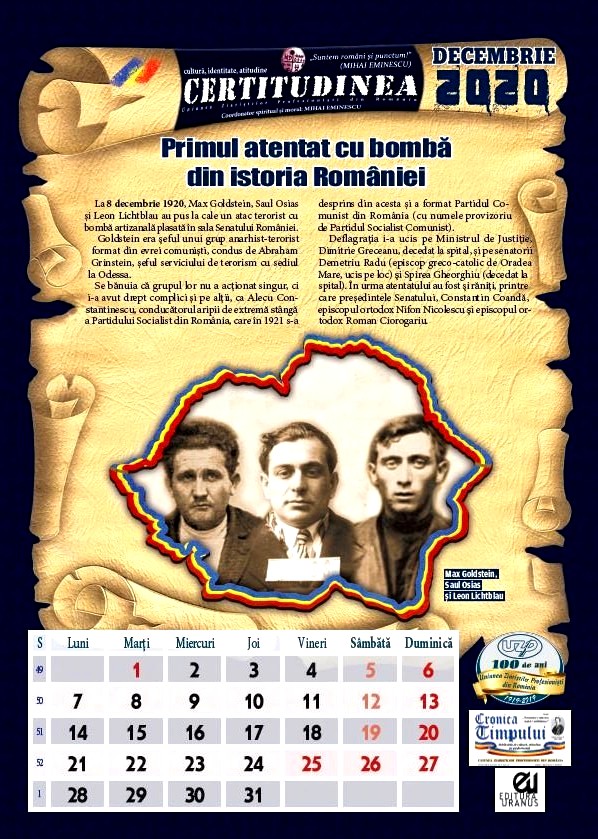 La 8 decembrie 1920, trei tineri evrei, Max Goldstein, Saul Osias și Leon Lichtblau, au pus la cale un atac terorist cu bombă artizanală plasată în sala Senatului României. Goldstein era șeful unui grup anarhist-terorist format din evrei comuniști, condus de Abraham Grinstein, șeful serviciului de terorism cu sediul la Odessa.